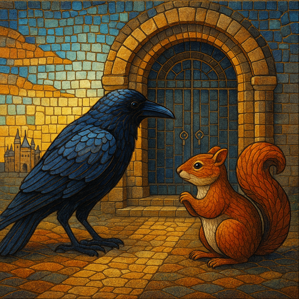 At the base of the tall brass doors stood a Squirrel, uniformed and still, his tail curled like punctuation.